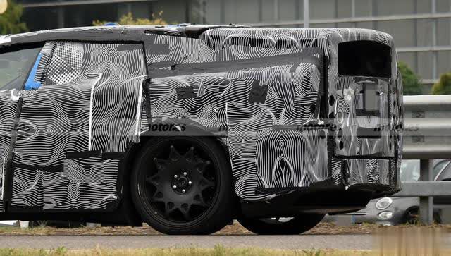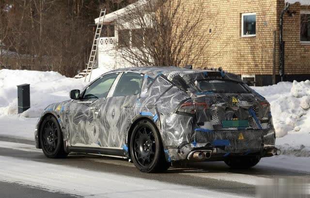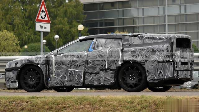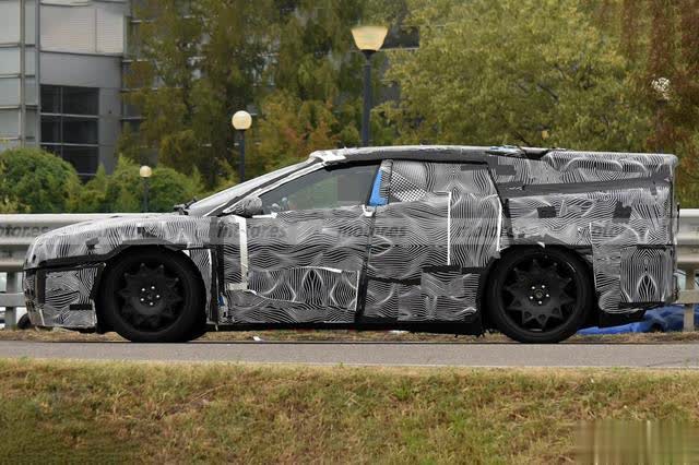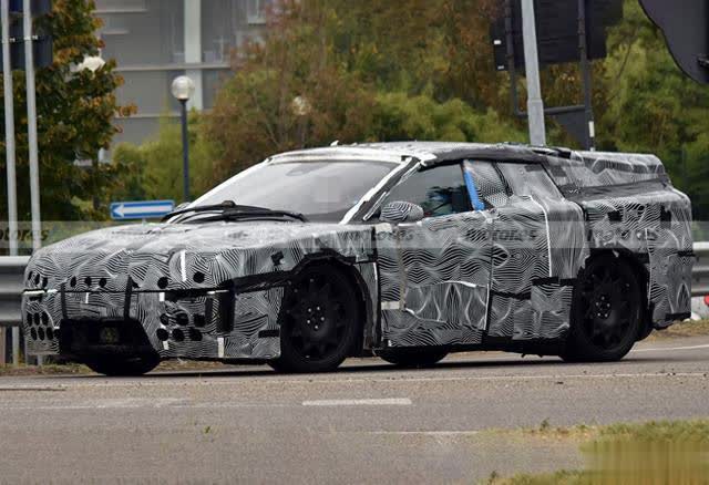 车身侧面呈现低矮溜背线条,车顶圆润过渡至车尾,门把手疑似采用按钮式开启设计,取代传统门碗造型提升科技感。前 23 英寸、后 24 英寸的交错式超大轮毂,优化前后轮抓地力与动态表现。车尾部分,借鉴玛莎拉蒂Levante设计元素,配备小尺寸扰流板与高位刹车灯,伪装下的四出排气布局则暗藏对燃油时代的致敬,实际或为扩散器装饰结构。车顶独特的“鱼鳍”天线可闪烁绿、红双色灯光,推测为充电状态指示灯,直观显示补能进度。